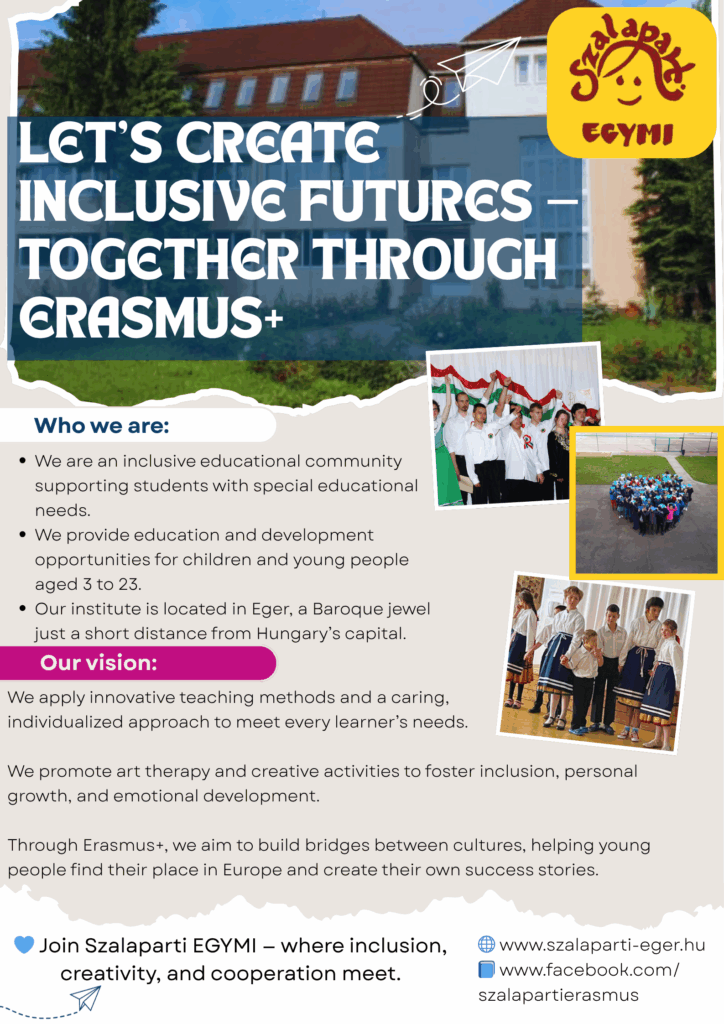 Az Egri Szalaparti EGYMI és Kollégium 2025-ben indította el Erasmus munkacsoportját, amelynek célja a nemzetközi szakmai kapcsolatok erősítése, valamint a korszerű, inkluzív és differenciált pedagógiai módszerek megismerése és adaptálása. Intézményünk innovációs munkaközösségének tagjaiként elkötelezetten készülünk első Erasmus+ pályázataink megírására és megvalósítására, hiszen meggyőződésünk, hogy a nemzetközi tapasztalatok integrálása és az európai értékrendek érvényesítése alapvető fontosságú a modern gyógypedagógiai gyakorlatban.